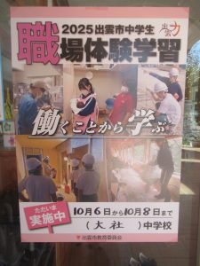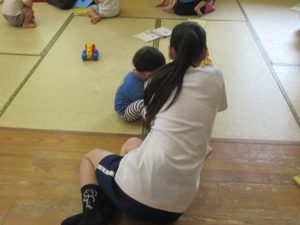 10月6日(月)~8日(水)に、たいしゃ保育園において、出雲市立大社中学校の3年生(2名)が職場体験学習を行いました。3日間、様々なクラスの子どもたちと関りをもちました。挨拶や表情も明るく、優しい言葉かけで子どもたちに接していただきました。今回の経験を、今後にいかしていってもらいたいです。