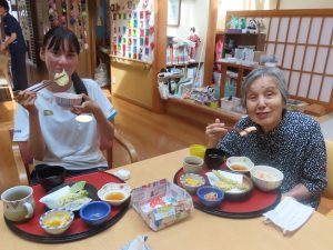 10月15日(水)~17日(金)に、ケアサポート相生において、出雲西高校の2年生(2名)が施設実習に来られました。1日目は、お楽しみ昼食会もあり、利用者様と一緒に秋の味覚を味わい楽しまれました。2日目は、個別支援ということで、4名のご利用者様と一緒にお買い物に出掛けました。「この日を楽しみにしていたよ。」「買い物なんて久しぶりだから嬉しいわ。」とみなさん大変喜ばれました。3日目は、実習生による「〇✖クイズ」のレクリエーションを行いました。今回の経験を進路にいかしていただければと思います。
