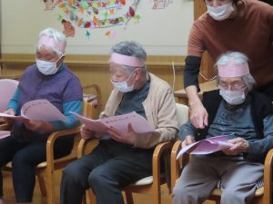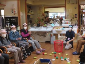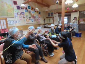 10月27(月)に、ケアサポート相生において、皆さんが毎月楽しみにされている街角コンサートを行いました。今回は、「運動会」という演出でした。赤・青に分かれ、パン食い競争・玉入れ・筒送りの競技に、みなさんハッスルして参加されました。いくつになっても運動会は気合が入り、心が燃えますね。キラキラした目の輝きに、若かりし頃の皆さんを見た気がします。