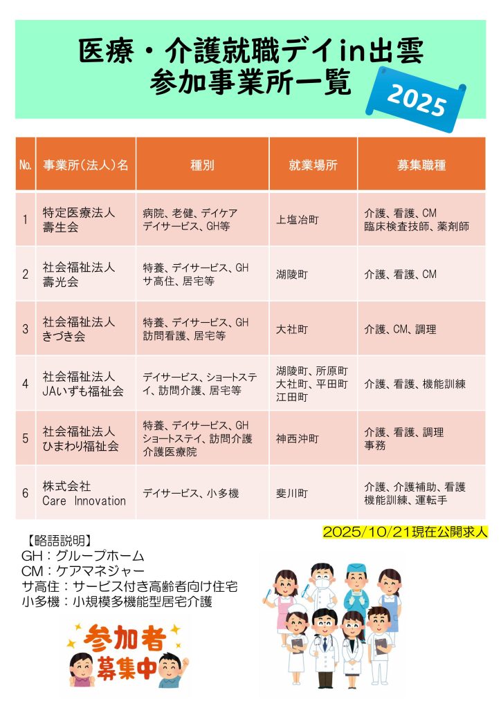 12月12日(金)に、出雲地方合同庁舎で開催されます『医療・介護就職デイ㏌出雲』に、社会福祉法人壽光会が参加します。福祉職場への就職を希望している方、関心がある方は参加をお待ちしております。