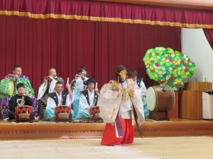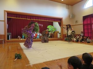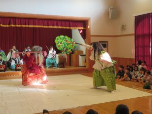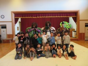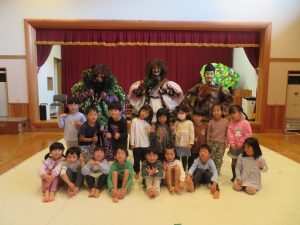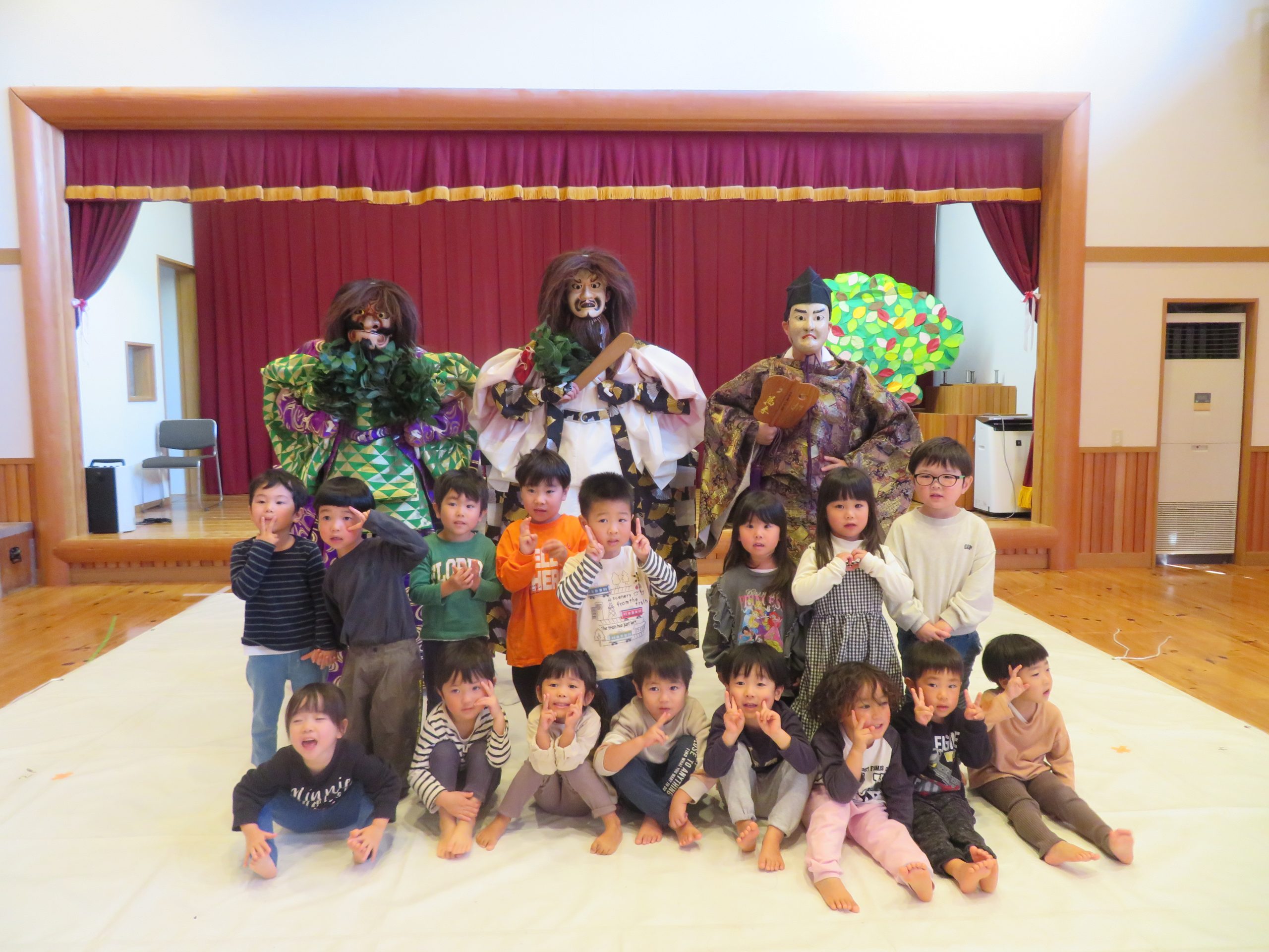 11月15日(土)に、たいしゃ保育園のきりん・ぱんだ・ぞう組が、大土地神楽を鑑賞しました。毎年、大土地神楽保存会の皆様のご厚意により、郷土芸能を堪能させていただいております。今年は、「猿田彦」「野見宿禰」の演目をしていただきました。演目の合間に解説もしていただき、お話がとてもわかりやすかったです。相撲の対戦では、こどもたちから大きなかけ声もあり、とても楽しい時間となりました。