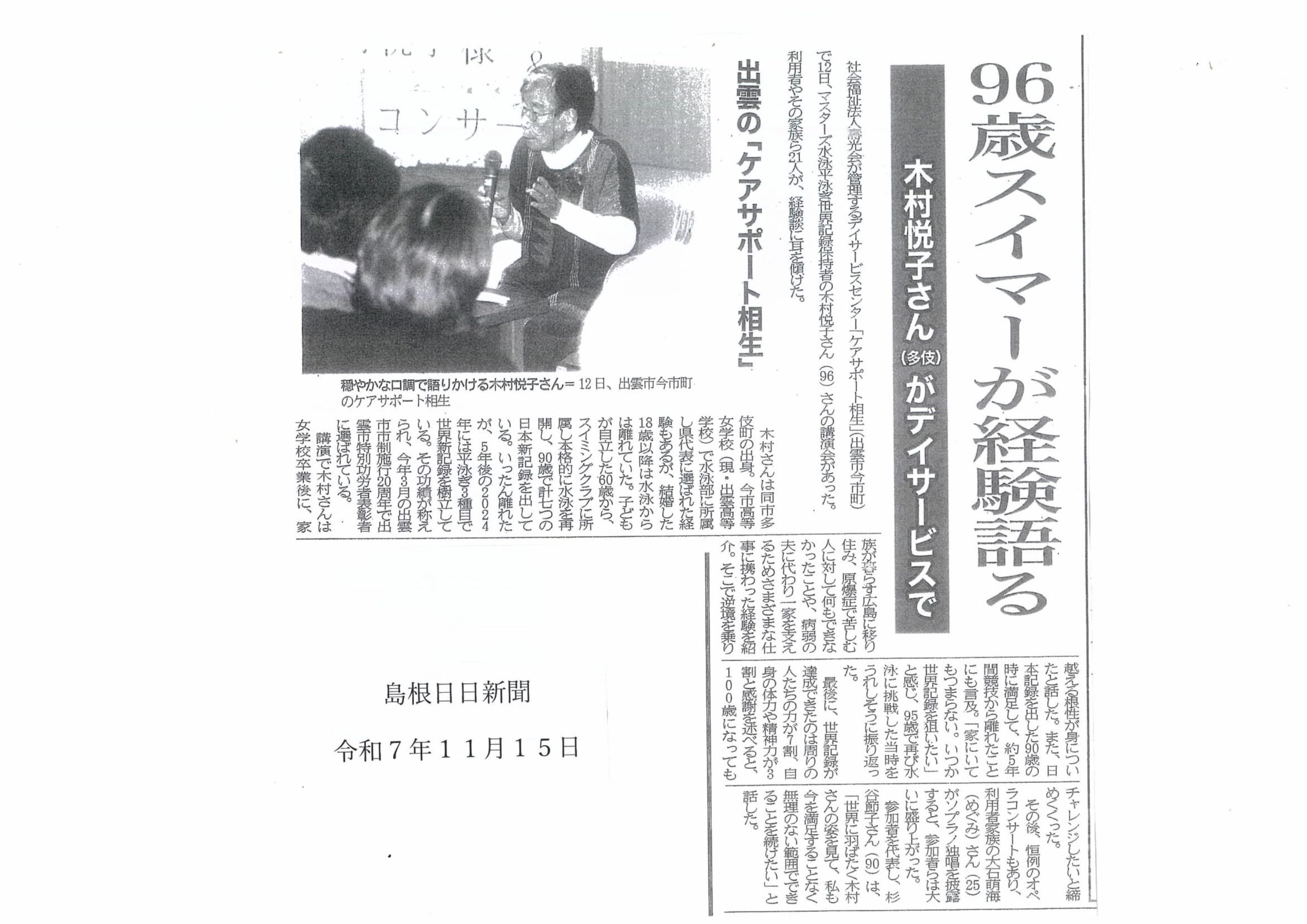 11月12日(水)に、ケアサポート相生において、95歳で平泳ぎの3種目(50M、100M、200M)で世界記録を樹立された木村悦子さんをお招きし、講演会を開いていただきました。その様子が、11月15日(土)発行の島根日日新聞に掲載されました。(掲載許可済)