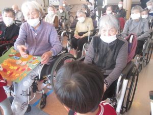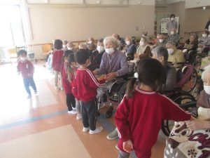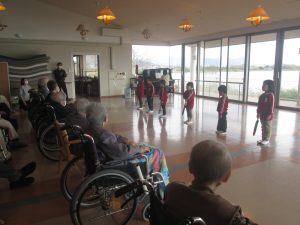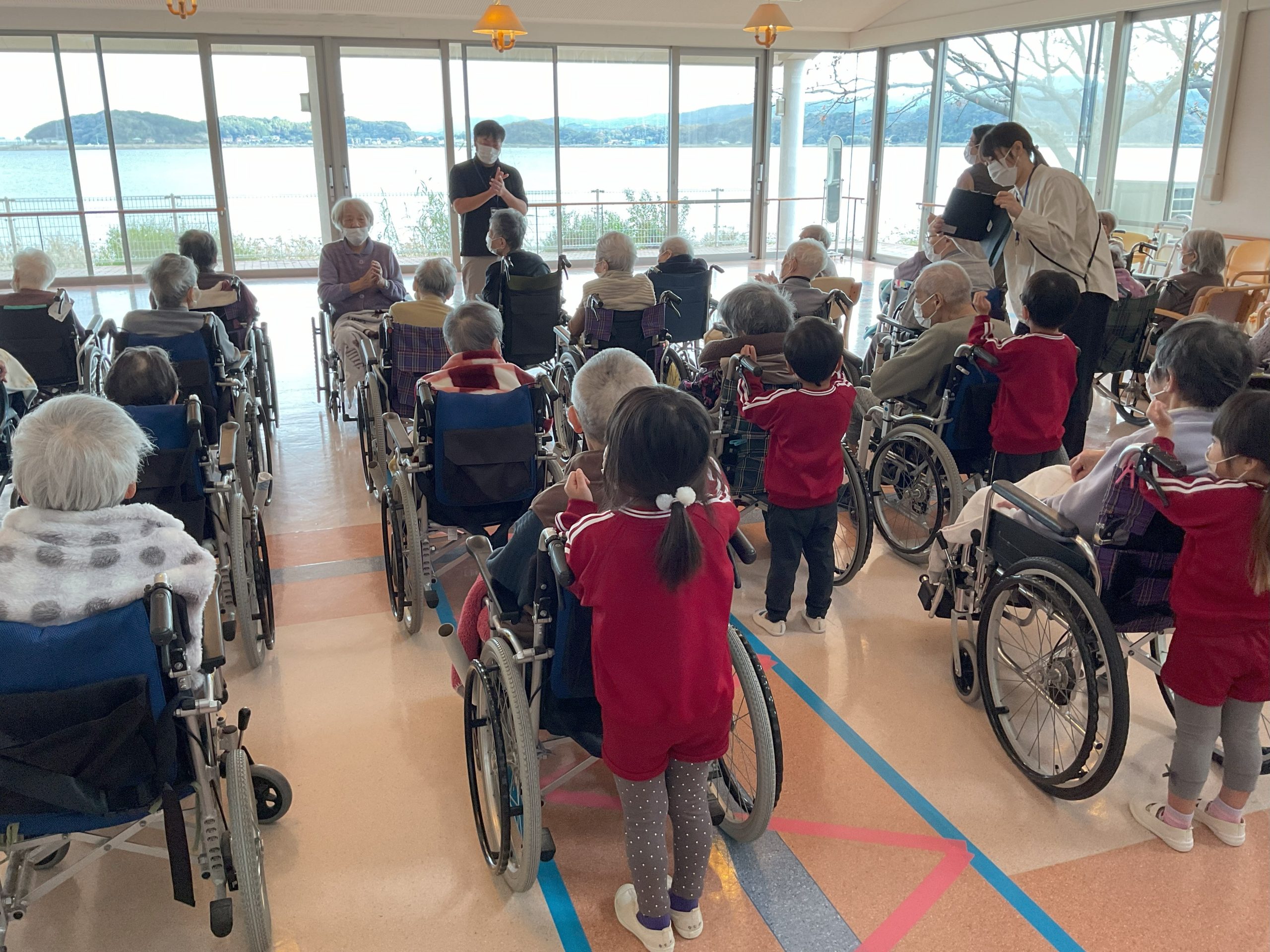 11月20日(木)に、特別養護老人ホーム湖水苑において、出雲市立湖陵幼稚園の園児さんとの交流を行いました。歌と入居者様に肩たたきをしていただきました。肩たたきでは、園児さんと交流ができ、楽しい時間を過ごすことが出来ました。帰りには、握手をしたり涙ぐまれる入居者様もおられました。園児さんからたくさんのパワーいただきました。