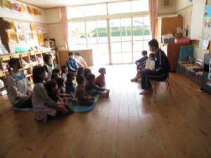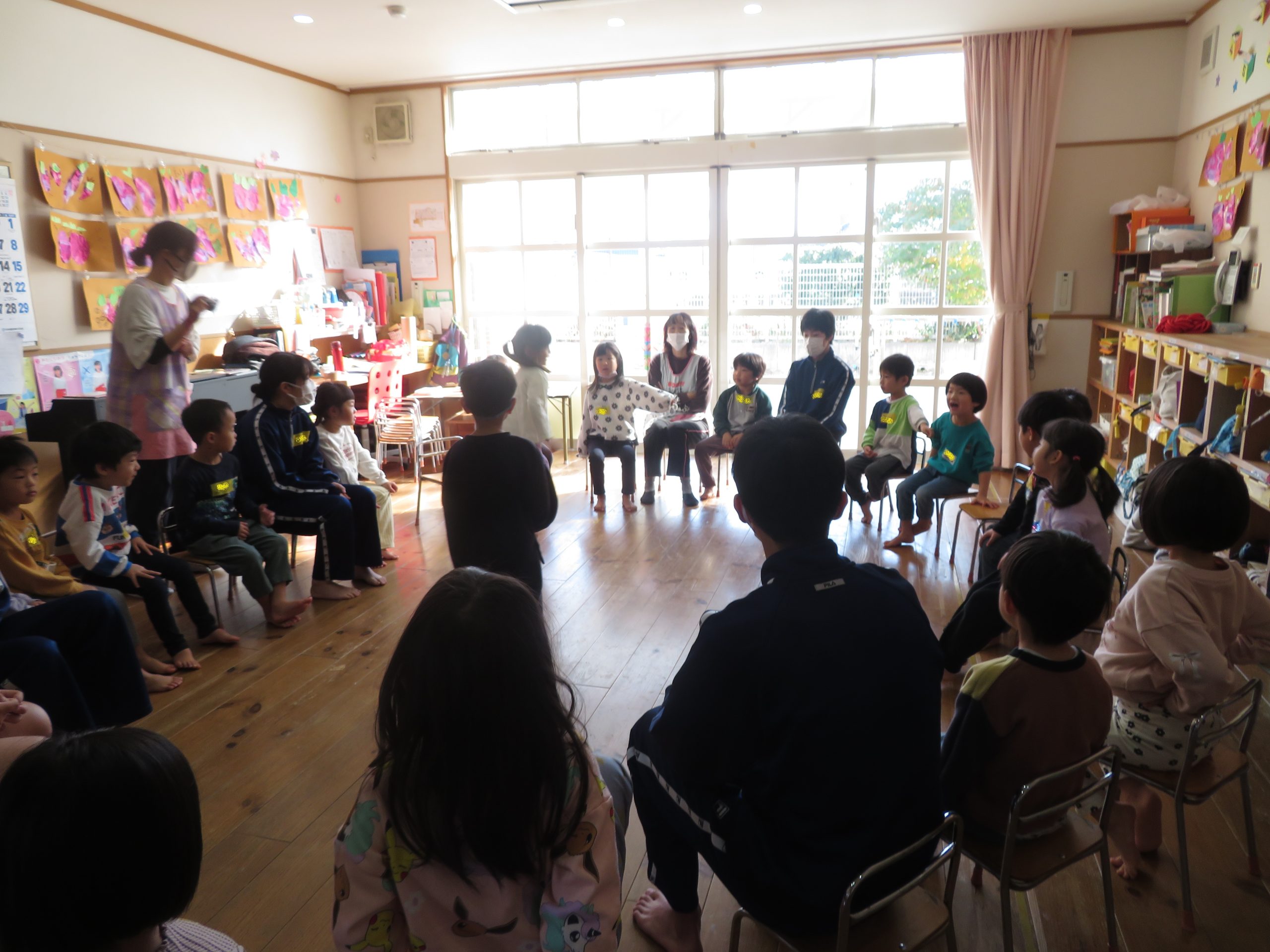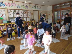 11月19日(水)・21日(金)に、たいしゃ保育園において、出雲市立大社中学校の3年1組・3年4組の生徒さんが保育実習を行いました。最初に、中学生の皆さんが準備してきてくれた絵本の読み聞かせをしていただきました。各年齢に応じた遊び(新聞ジャンケン、フルーツバスケット、手作りのマラカス遊びなど)をして、たくさんのお兄さん・お姉さんと仲よく楽しい時間を過ごしました。