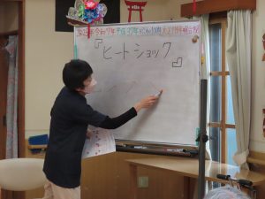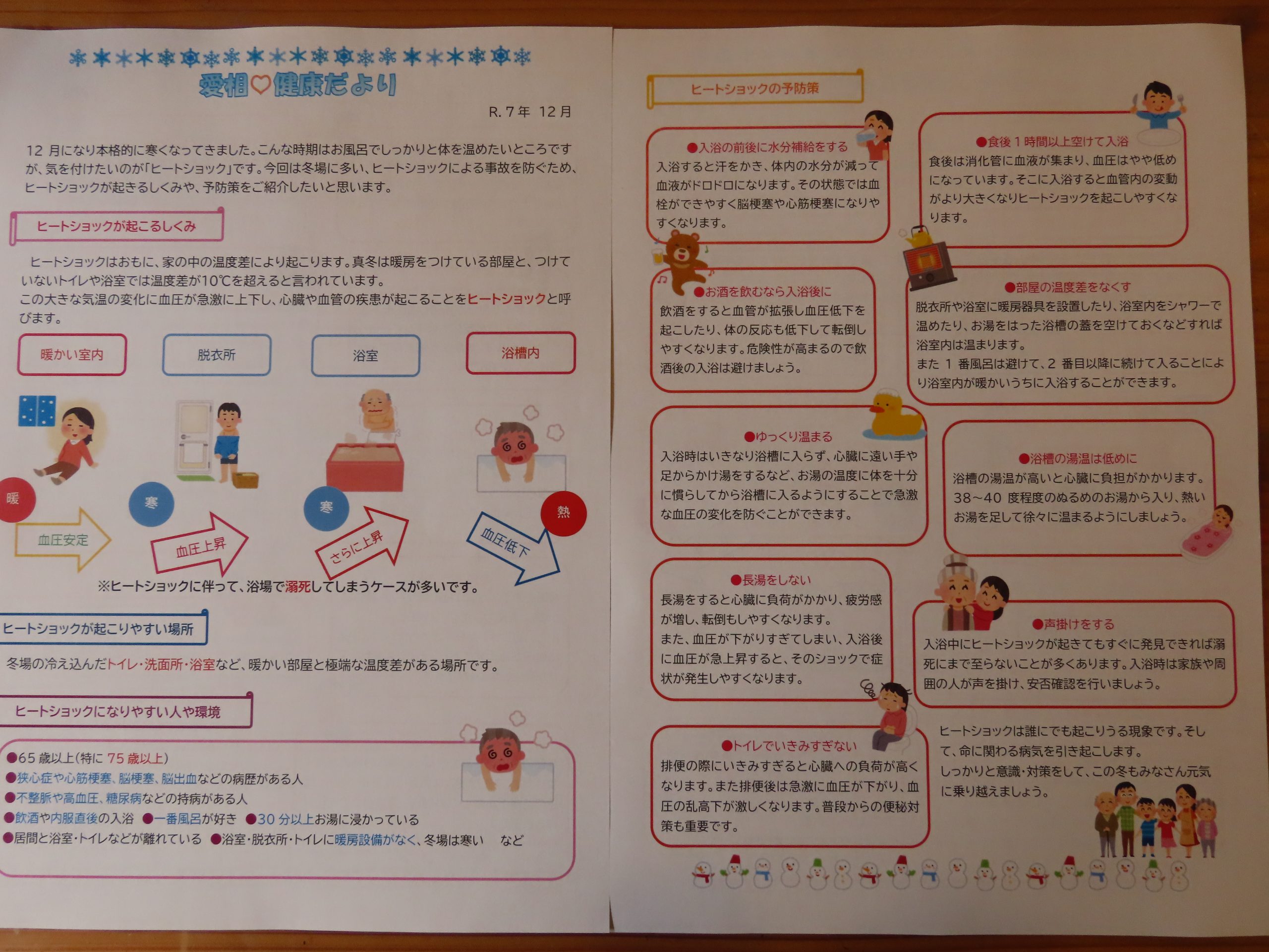 12月3日(水)に、ケアサポート相生において、今年も冬場のヒートショック予防についての健康講座を開催しました。この季節になるとニュースでも取り上げられることが多く、みなさん「冬場はこれが一番怖いよね。」「私も家で気を付けているよ。」とのお声がありました。お便りもお配りし、みなさんと再度ヒートショックの起こる仕組みや予防策について振り返りました。寒い季節になると、一段と増加するヒートショックですので、職員も含め、今年も予防策を取りながら、元気にこの冬を乗り越えていけたらと思います。