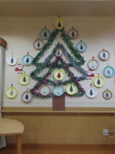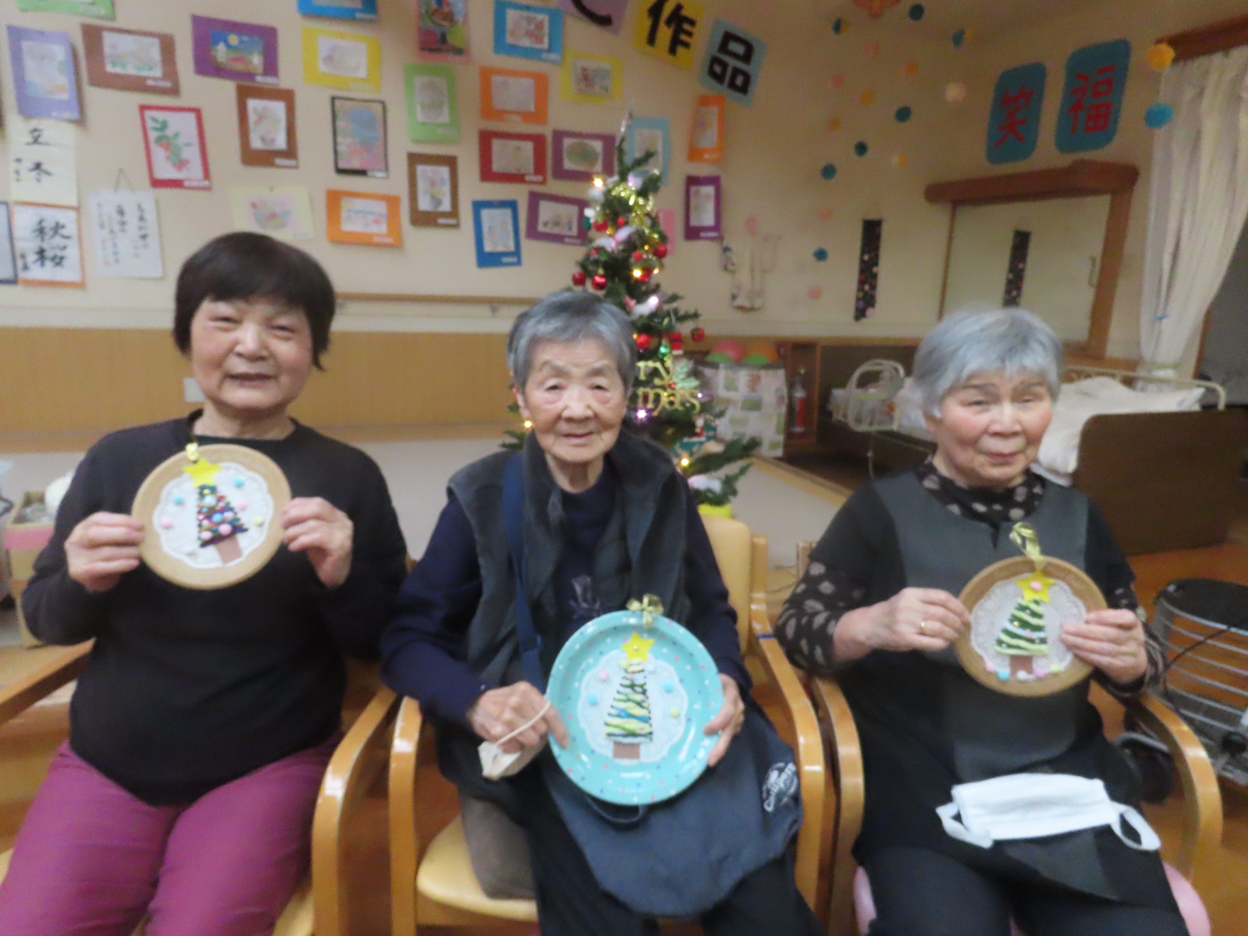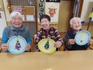 12月に入りクリスマスも近づいてきました。12月10日(水)に、ケアサポート相生において、クリスマスの創作活動を今年も行いました。穴を空けた紙皿にお好きな色の毛糸を通してもらい、シールなどで飾り付けます。みなさん素敵なツリーが出来上がり、「可愛いのができたね」と喜んでおられました。相生のクリスマス会もみなさんのツリーで素敵な雰囲気でした。