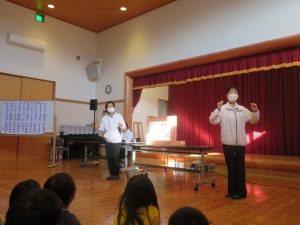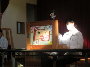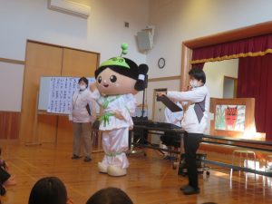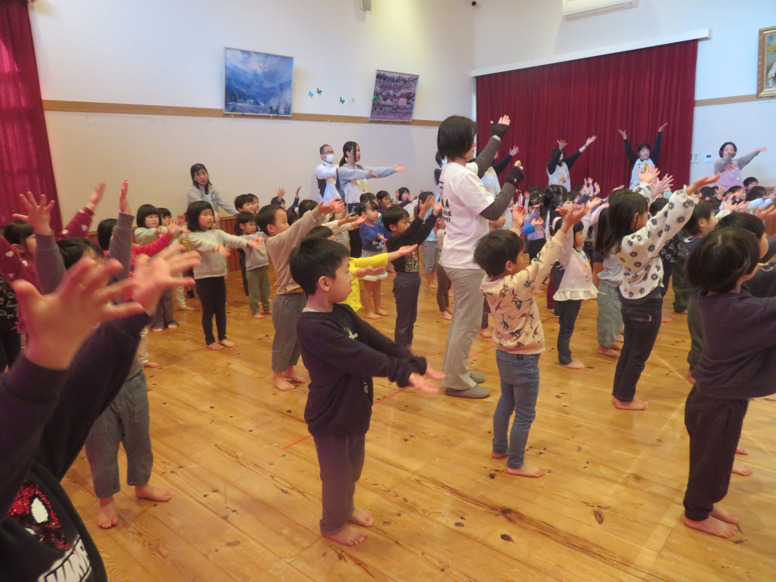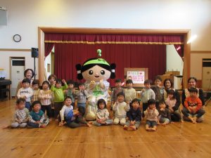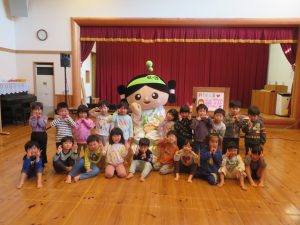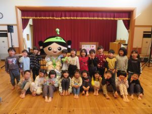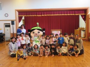 12月19日(金)に、たいしゃ保育園のうさぎ・きりん・ぱんだ・ぞう組において、島根県立古代出雲歴史博物館様によるワークショップを行いました。初めに出雲大社や古代出雲に関する紙芝居を観ました。その後、雲太くんが登場すると「かわいい」と喜び、雲太くんと一緒に楽しく体操をしました。住んでいる土地の歴史について学ぶ機会となりました。ありがとうございます。