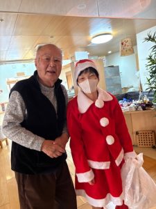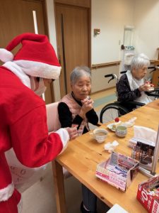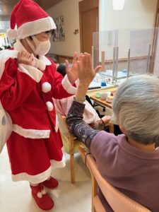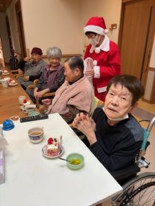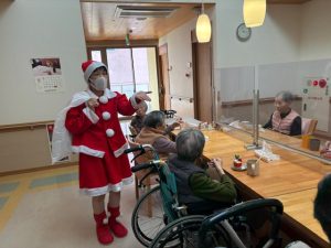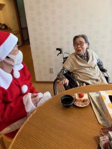 12月25日(木)に、サービス付き高齢者向け住宅ヴィラ湖水苑に、今年もサンタがやって来ました。今年も可愛いクリスマスケーキをプレゼントし、喜んでいただきました。サンタを見ると皆さん笑顔になられ、最近はお部屋で多く過ごされる方も元気な表情を見せて下さいました。