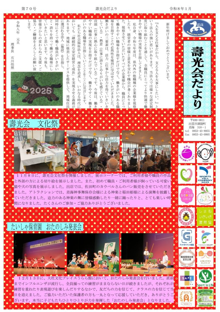 社会福祉法人壽光会では、年4回(1月・4月・7月・10月)広報誌『壽光会だより』を発行しております。このたび、第70号(2026年1月)を発行いたしました。