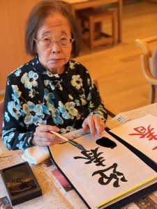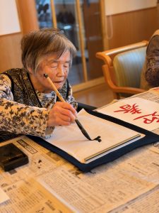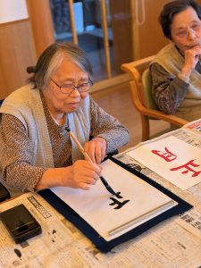 1月2日(金)に、グループホーム湖水苑において、今年もお正月に行われる習わしのひとつである「書初め」を行いました。皆さん筆を持ち真剣に半紙に向かわれており、今年も一年皆さんが健康に過ごしていて頂けることを願いました。また、職員も一緒に書初めに参加しました。