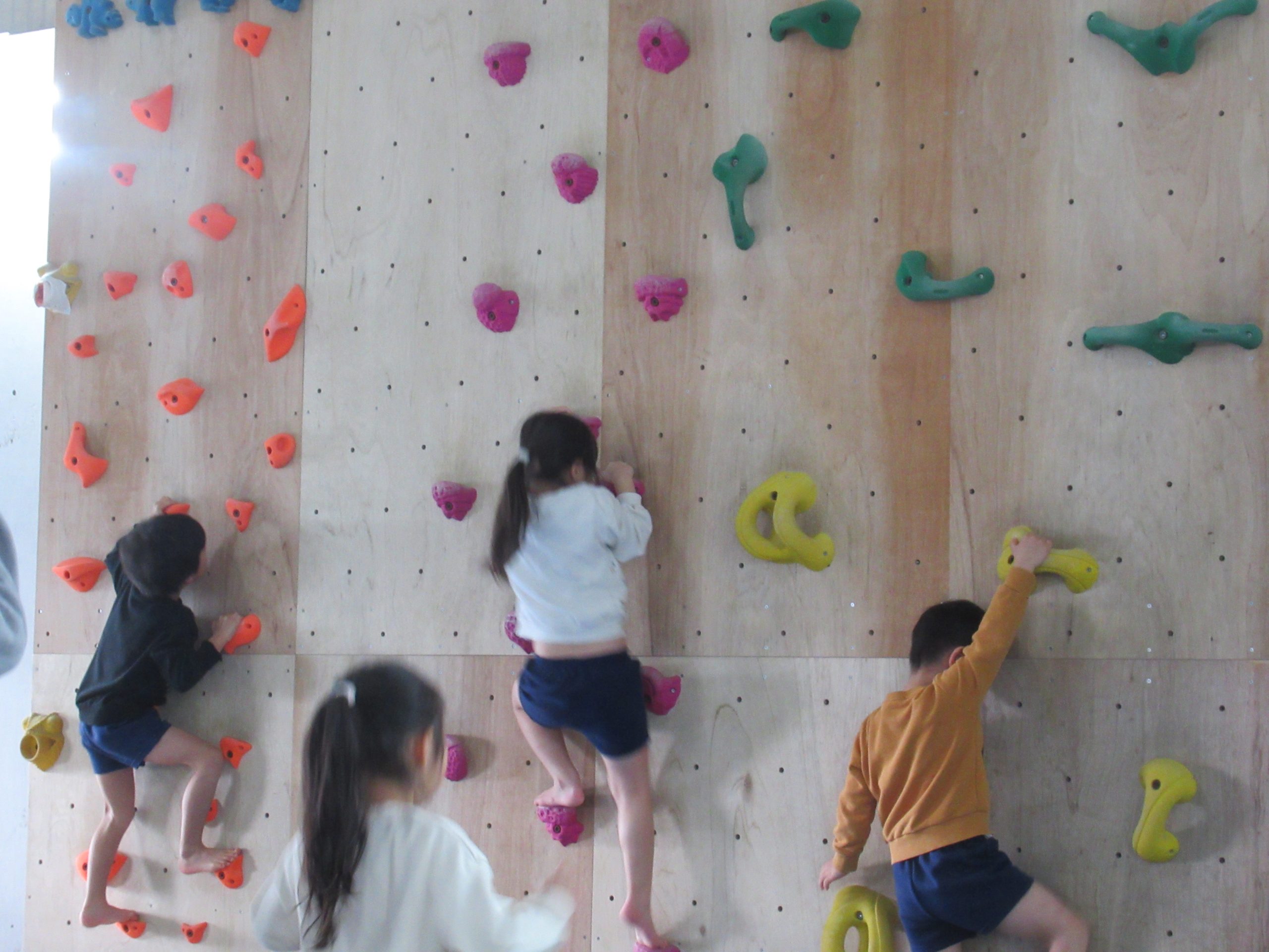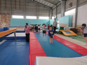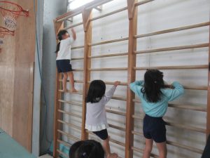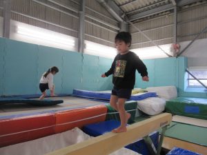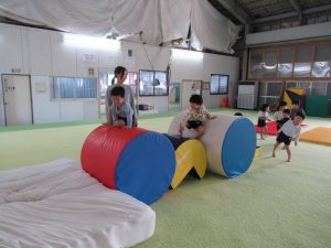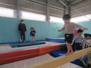 1月19日(月)に、たいしゃ保育園のきりん・ぱんだ・ぞう組において、ジョイナススポーツクラブで体操教室を行いました。きりん組にとっては、トランポリン・はねる床・肋木など初めて経験することも多く、楽しんで取り組みました。特にトランポリンが好きな子が多く、足を伸ばしたり高く飛ぶことを意識し、からだを思いっきり動かしました。