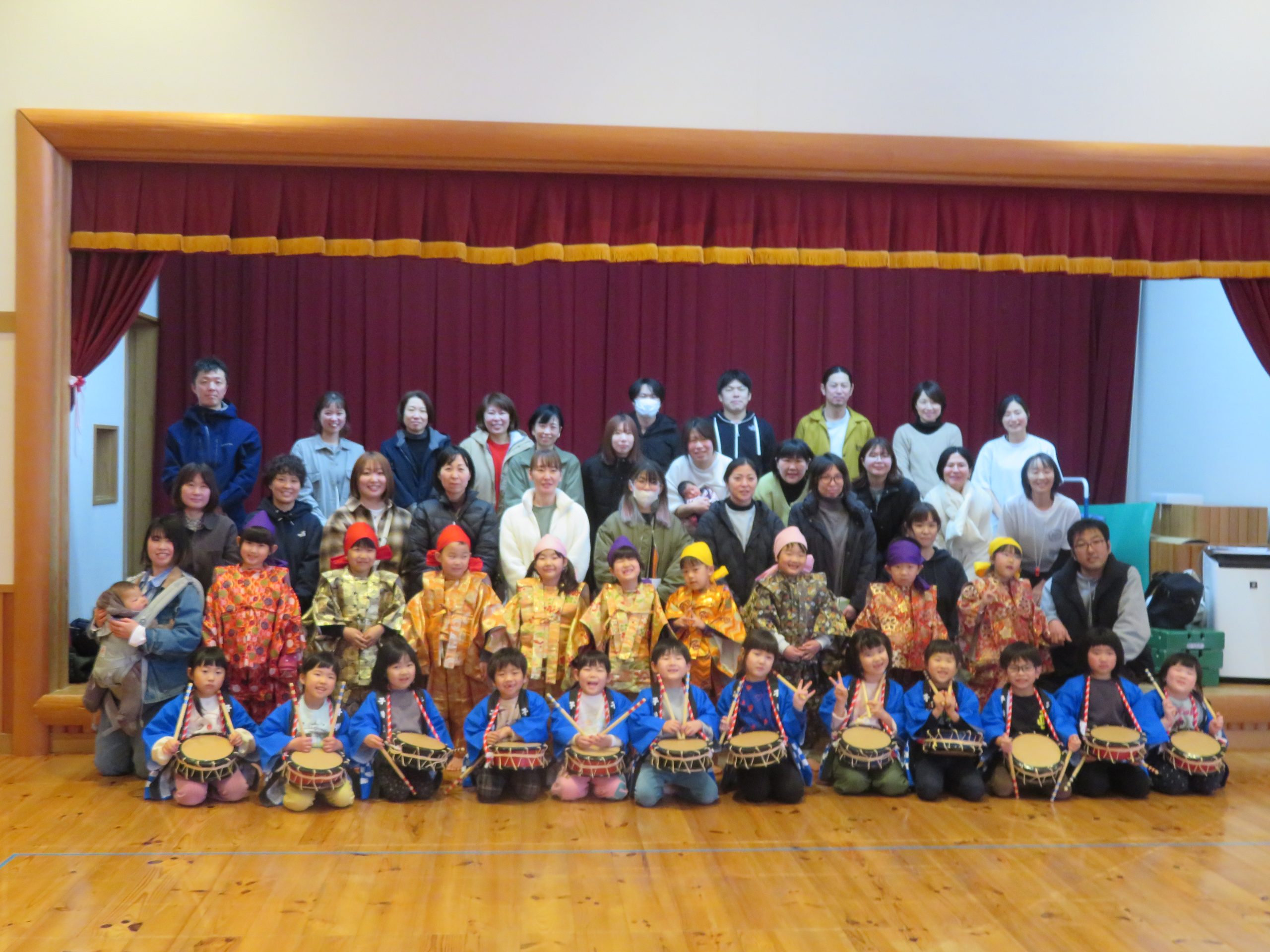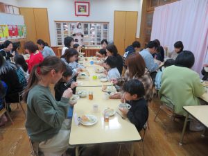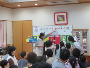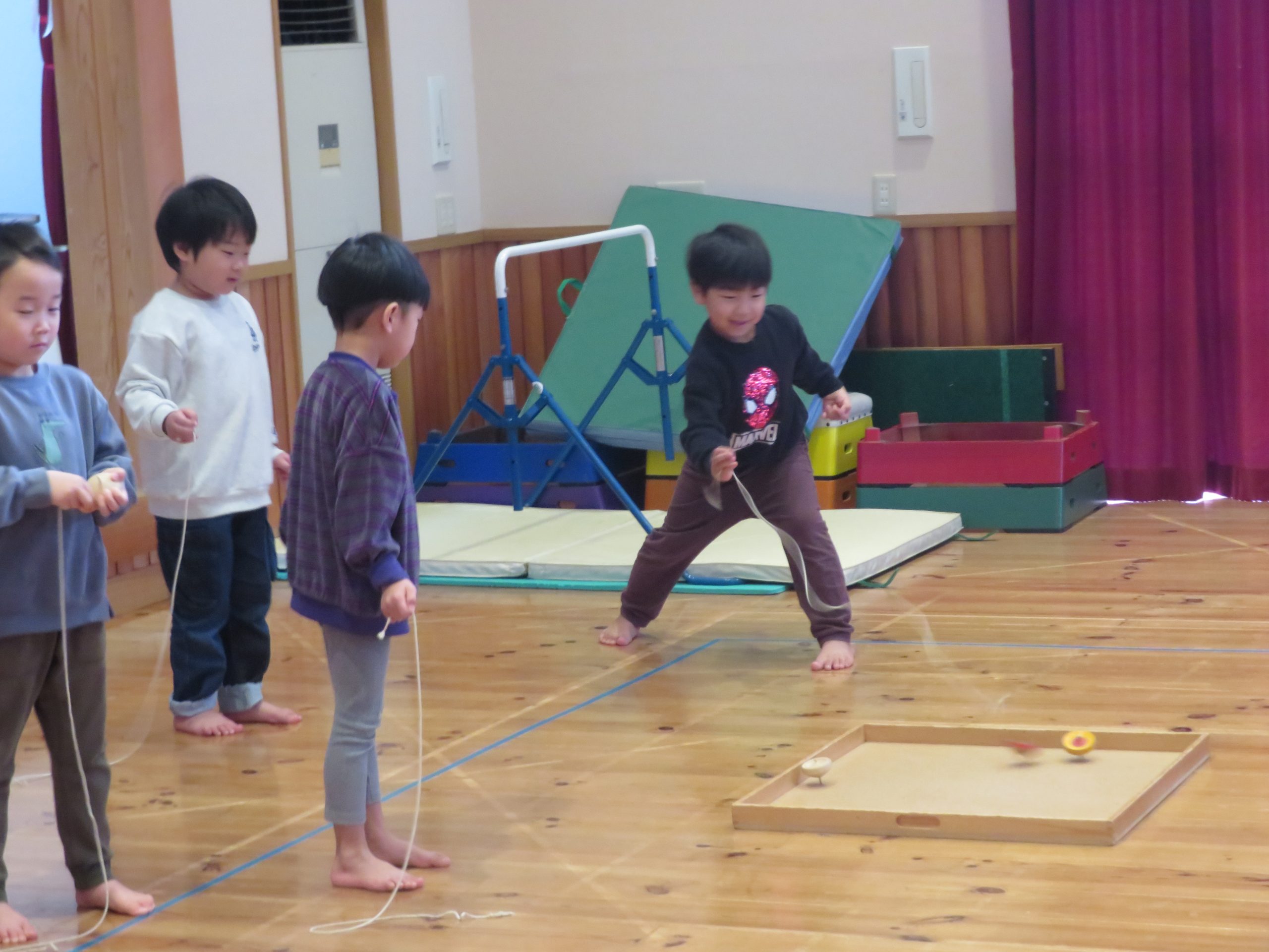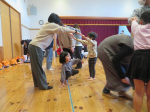 1月28日(水)に、たいしゃ保育園において、ぞう組の保育参加日を行いました。この日を子どもたちは、ずっと楽しみにしておりました。ステージの上で歌を発表した後、コマまわし・跳び箱・鉄棒と見せたい遊びを頑張って披露しました。その後、保護者の方とドッジボールで対戦しました。給食試食会では、三大食品群について学ぶ姿を見てもらいました。保育園生活で保護者の方と一緒に食べる給食を楽しみました。
