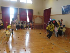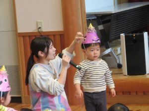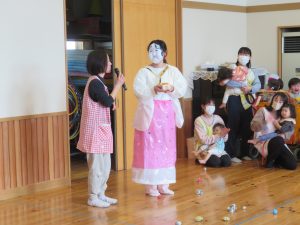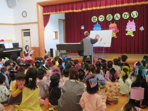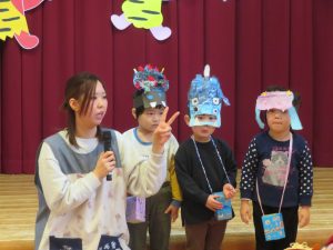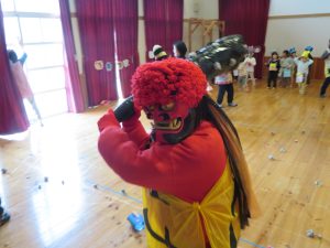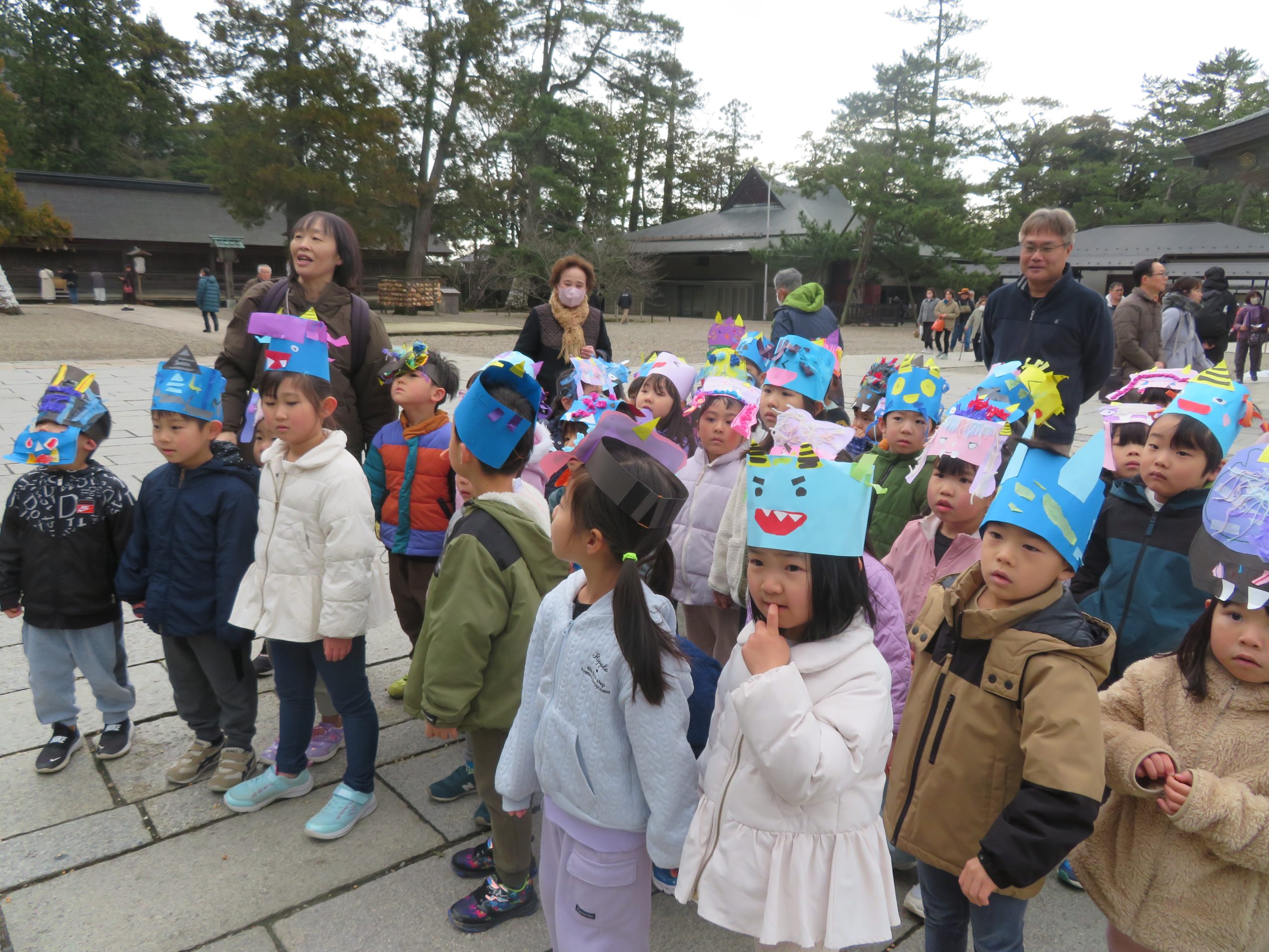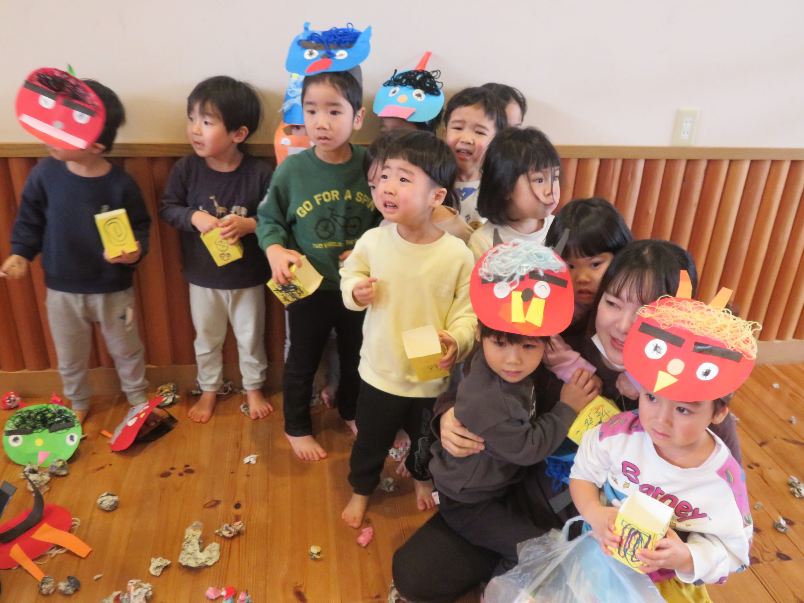 2月3日(火)に、たいしゃ保育園において、節分会を行いました。はじめにペープサートで、節分について学んだ後、クラスごとに鬼のお面の紹介をしました。自分たちで作ったお面と固い豆。これがあれば大丈夫といきこんで挑んだ鬼退治。太鼓の音とともにやってきた鬼たち。逃げ惑う子ども、勇敢にも立ち向かう子ども、泣いてしまう子どもと様々でした。最後は、福の神がこられ、ホッとしていました。その後、うさぎ・きりん組は前原荒神社に、ぱんだ・ぞう組は出雲大社に、お面をつけてお参りに行きました。