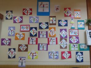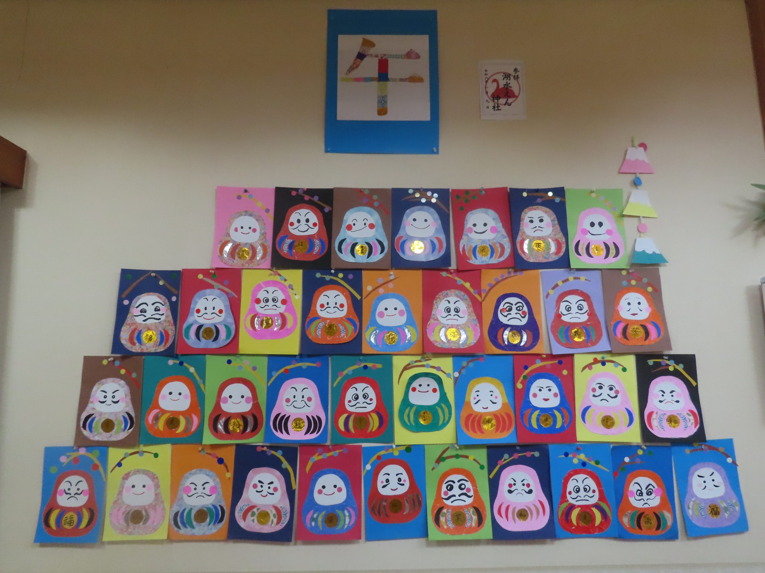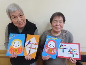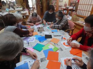 ケアサポート相生では、1月に、今年の干支『午』のちぎり文字に挑戦しました。今回で3年目になり、干支のちぎり文字を楽しみにして下さる方もあります。作品は、自宅で1年間皆様を見守ってくれます。また、2月5日(木)から、全利用者様と縁起の良い『だるま』の創作をしました。色紙の色やそれぞれが描かれた表情で、また違った『だるま』が完成しました。壁に飾った全員分のだるまは何とも可愛らしいです。壁画の前で、集まり談笑しておられる姿も相生をほっこりさせてくださいます。次の創作は、さて何でしょう??
