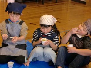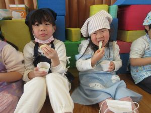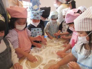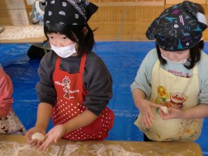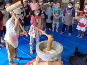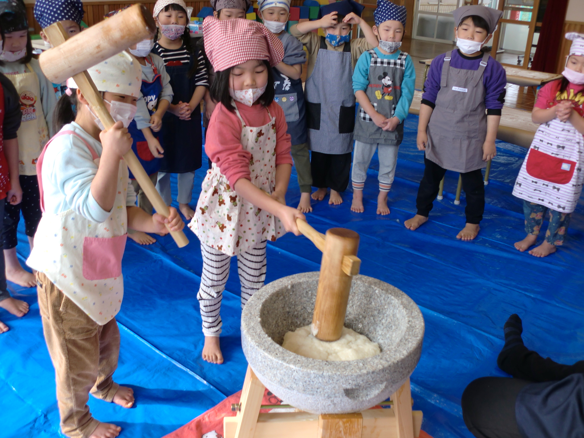 2月6日(金)に、たいしゃ保育園のぱんだ・ぞう組が、もちつき会を行いました。蒸したてのもち米を1口ずつ食べてみると、「おいしい!このお米モチモチ」と、いつものお米と違うことを発見していました。「よいしょ!よいしょ!」とかけ声をかけ、おもちをつきました。つぶつぶだったお米が、「ぺたんぺたん」と音をたてながらまとまっていく様子をみて、「いいにおい」「おしいそう」「のびてる」と、感想がとまりませんでした。自分たちで丸めたおもちは、格別の味でした。
