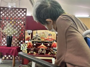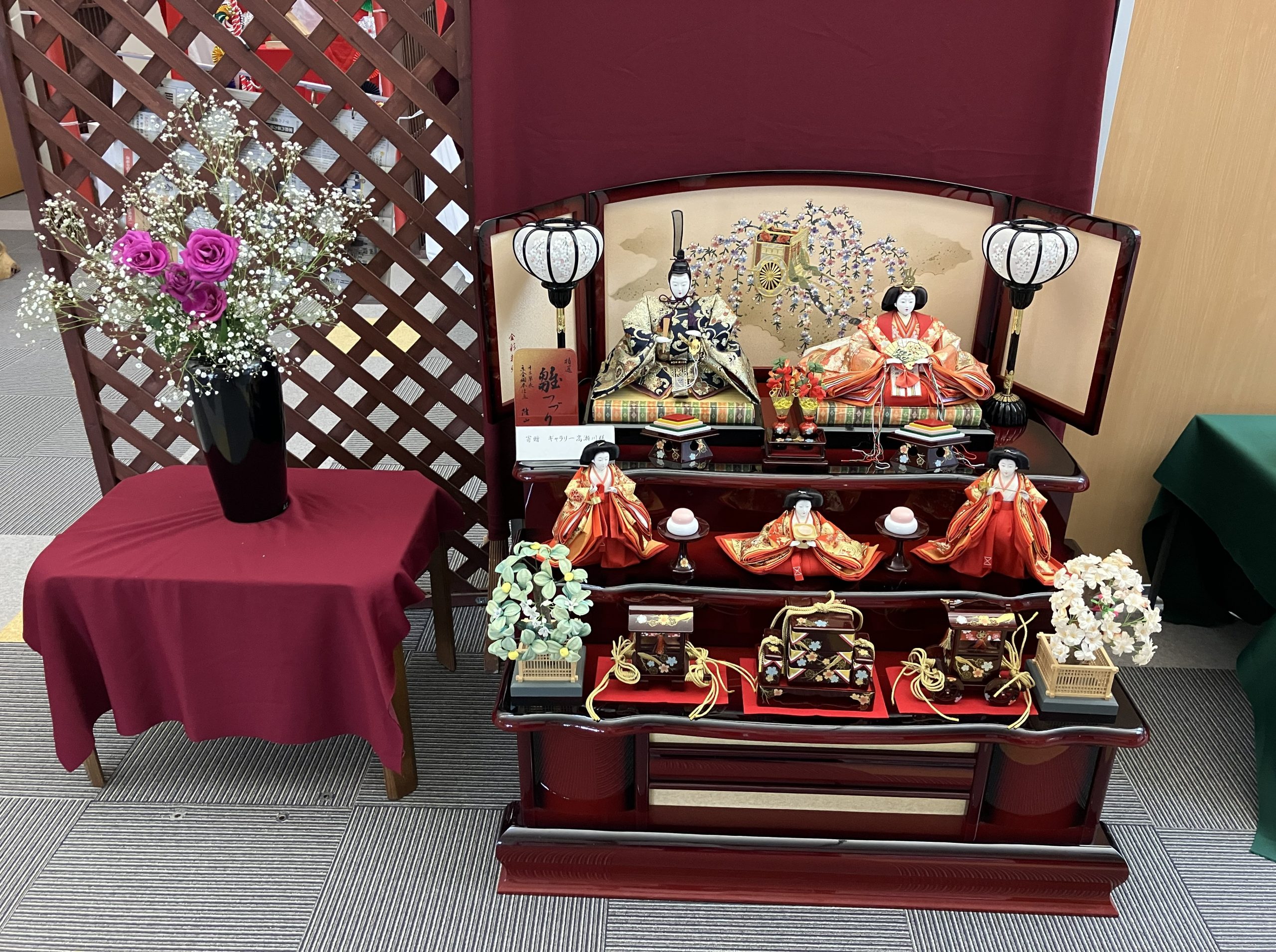 2月10日(火)に、特別養護老人ホーム湖水苑のハマナスホールにおいて、雛壇の飾りつけをしました。入居者の皆様や来苑される方々に大変好評です。隣にある生け花は職員作で、季節ごとにご披露させてもらっています。雛壇飾りと共に春の訪れを感じさせてくれる風景となりました。