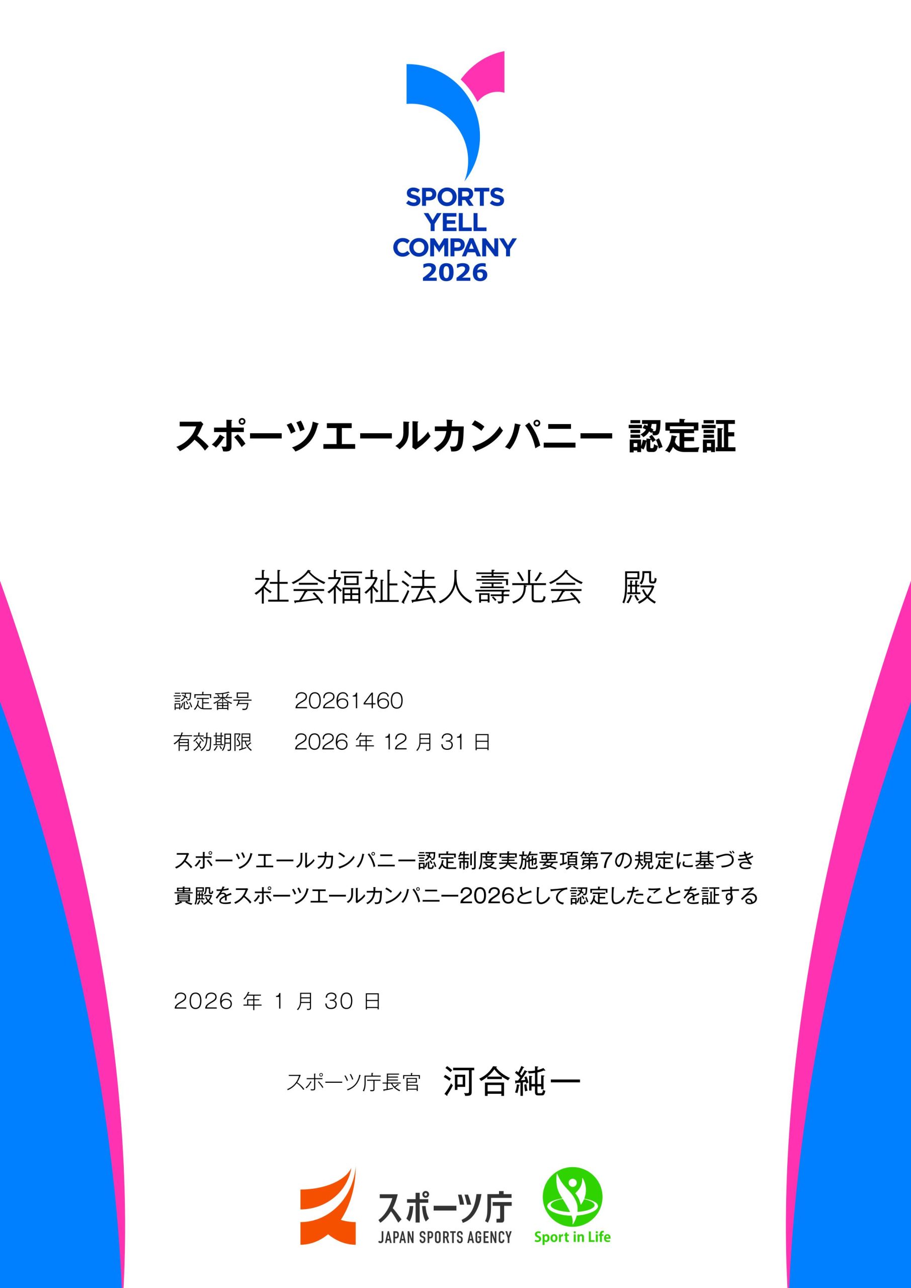 このたび、社会福祉法人壽光会において、『スポーツエールカンパニー2026』の認定(3年連続)を受けました。スポーツエールカンパニーとは、スポーツ競技に限らず、社員の健康増進のためのスポーツの実施に向けた積極的な取組を行っている企業をスポーツ庁が認定しております。引き続き、職員の健康増進を図っていきたいと思います。