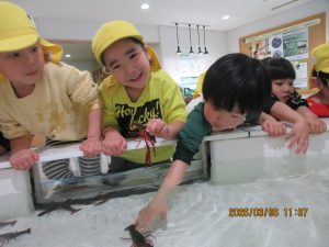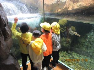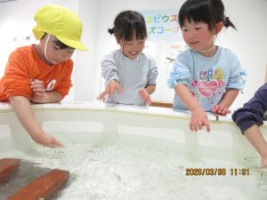 3月6日(金)に、たいしゃ保育園のきりん組が、島根県立宍道湖自然館ゴビウスにお別れ遠足に出かけました。水槽をじーっとのぞきこんだり、知っている魚の名前を言い合ったりと楽しそうな子どもたちでした。「さわってみよう」のコーナーでは、おそるおそるドクターフィッシュやザリガニに触れている子もいれば大喜びの子もいたりと様々でした。あいにくの天候でしたが、楽しい遠足となりました。