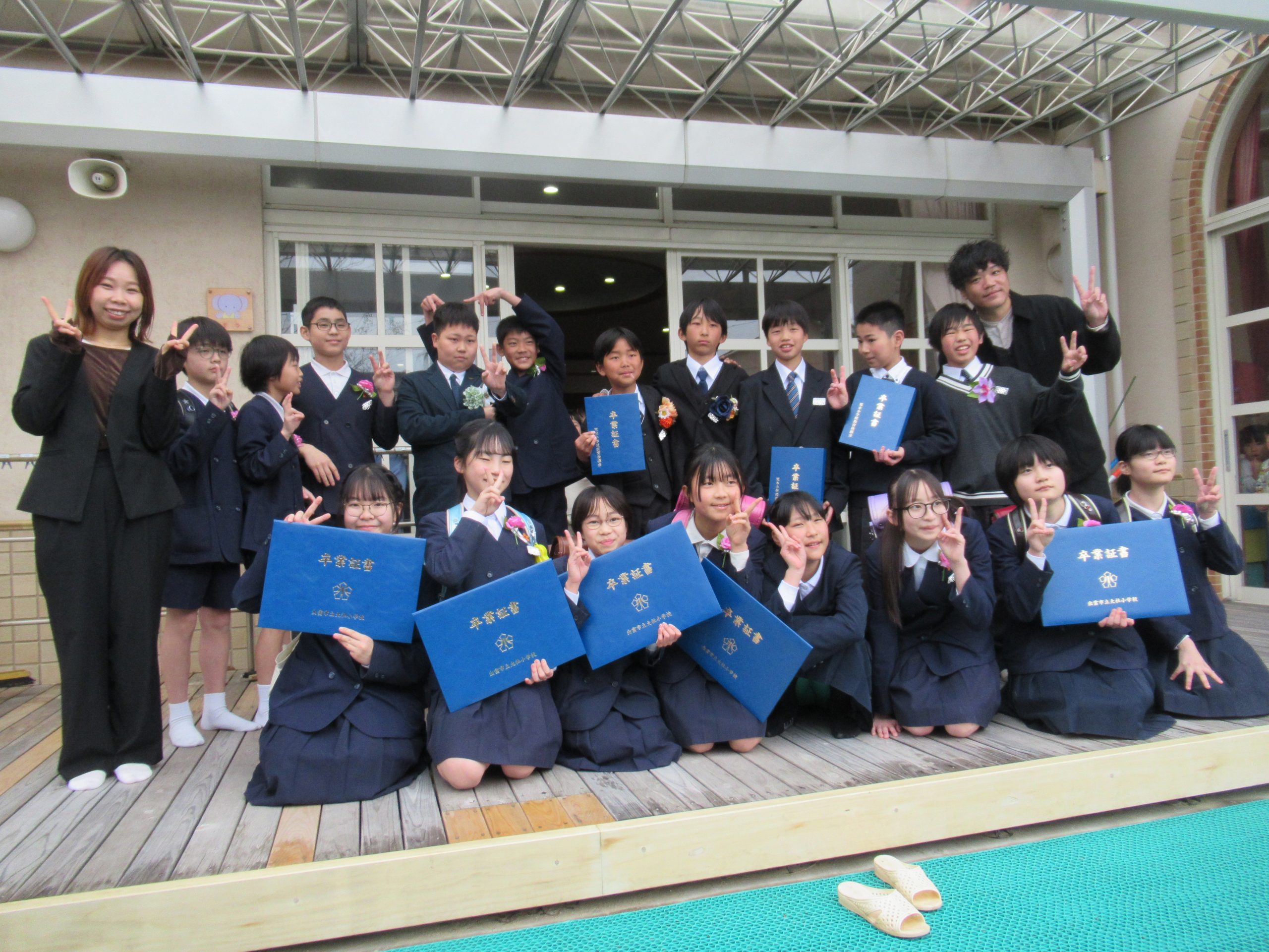 3月18日(水)に、出雲市内の小学校で卒業式がありました。式の後、たいしゃ保育園に、続々と小学校卒業の報告に来てくれました。また、当時の担任先生もかけつけてくれました。この6年間で、心も体も大きく成長した姿はとても凛々しいです。中学校でのますますの活躍を祈念します。本日は卒業おめでとうございます。