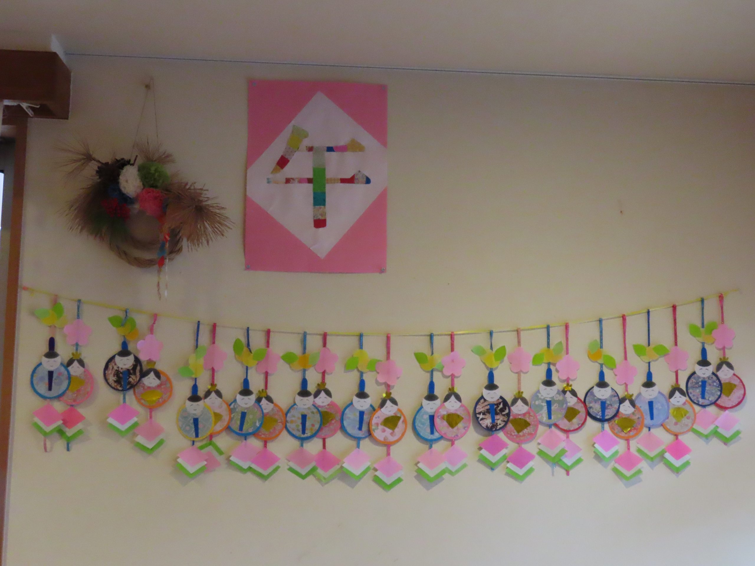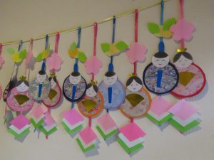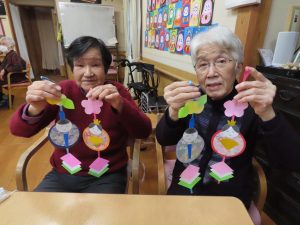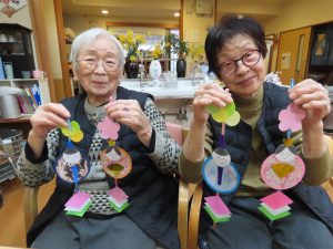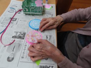 ケアサポート相生において、3月の創作活動は可愛らしいお雛飾り作りに取り組みました。お好きな柄や色の紙を1枚ずつ選んでいただき、ていねいに貼り付け、紐に貼り付けて完成です。お一人お一人個性のある可愛らしいお雛様とお内裏様が出来上がりました。玄関前の壁に飾り付け、今年も華やかな雛人形がみなさんを迎えてくださっています。